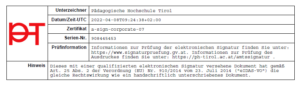 Die Pädagogische Hochschule Tirol nutzt – ebenso wie ihre Partner in der Wirtschaft – moderne Technologien zur effizienten Erfüllung ihrer Aufgaben. Um Dokumente zeitgemäß, rasch und sicher ausstellen zu können, wurde die Amtssignatur eingeführt.