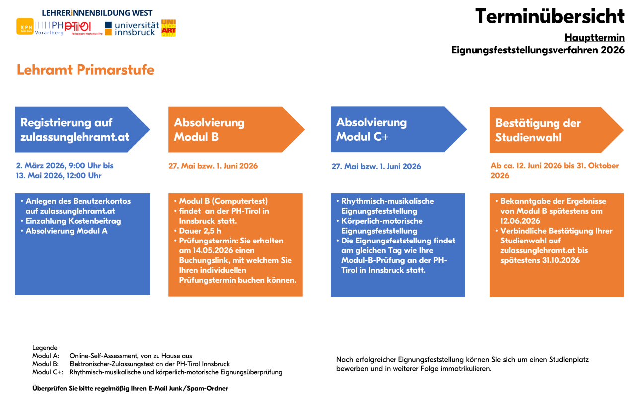 Die Modul C+ Prüfungen finden am gleichen Tag wie Ihre Modul B Prüfung in Innsbruck statt. Sie müssen somit nur einmal an die Pädagogische Hochschule Tirol anreisen. Es ist keine gesonderte Anmeldung für Modul C+ nötig, dies geschieht automatisch mit der Buchung Ihres Prüfungstermins zu Modul B und der Studienwahl Primarstufe auf zulassunglehramt.at .