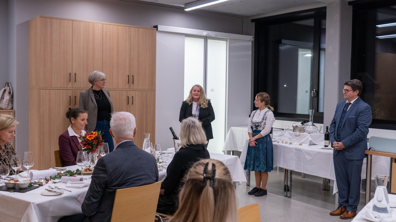 Nach dem Empfang wurden die Gäste in den Servierraum geleitet, wo Christine Schöpf als Studienleiterin für den Fachbereich Ernährung den Abend mit einer kurzen, pointierten Ansprache eröffnete. Ingrid Hotarek, die Institutsleiterin für Berufspädagogik, schloss sich mit herzlichen Grußworten an und betonte den besonderen Stellenwert dieser Veranstaltung für die praxisorientierte Ausbildung der Studierenden.