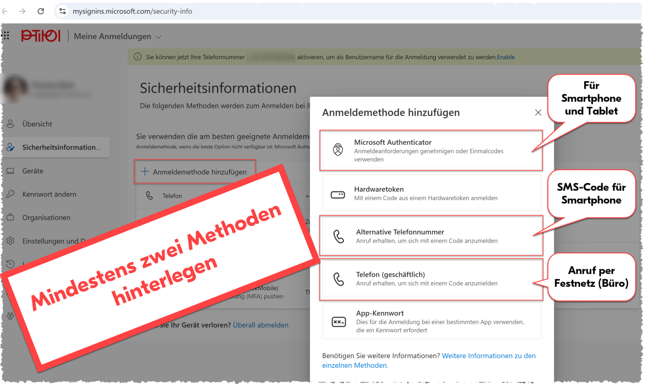 - Fügen Sie bitte jedenfalls auch eine Anmeldemethode vom Typ „Alternative Telefonnummer“ hinzu (SMS-Code oder Anruf erhalten). Sollten Sie Ihr Smartphone verlieren, können Sie mithilfe des neuen Smartphones mit SMS-Code in Ihr Konto einsteigen.