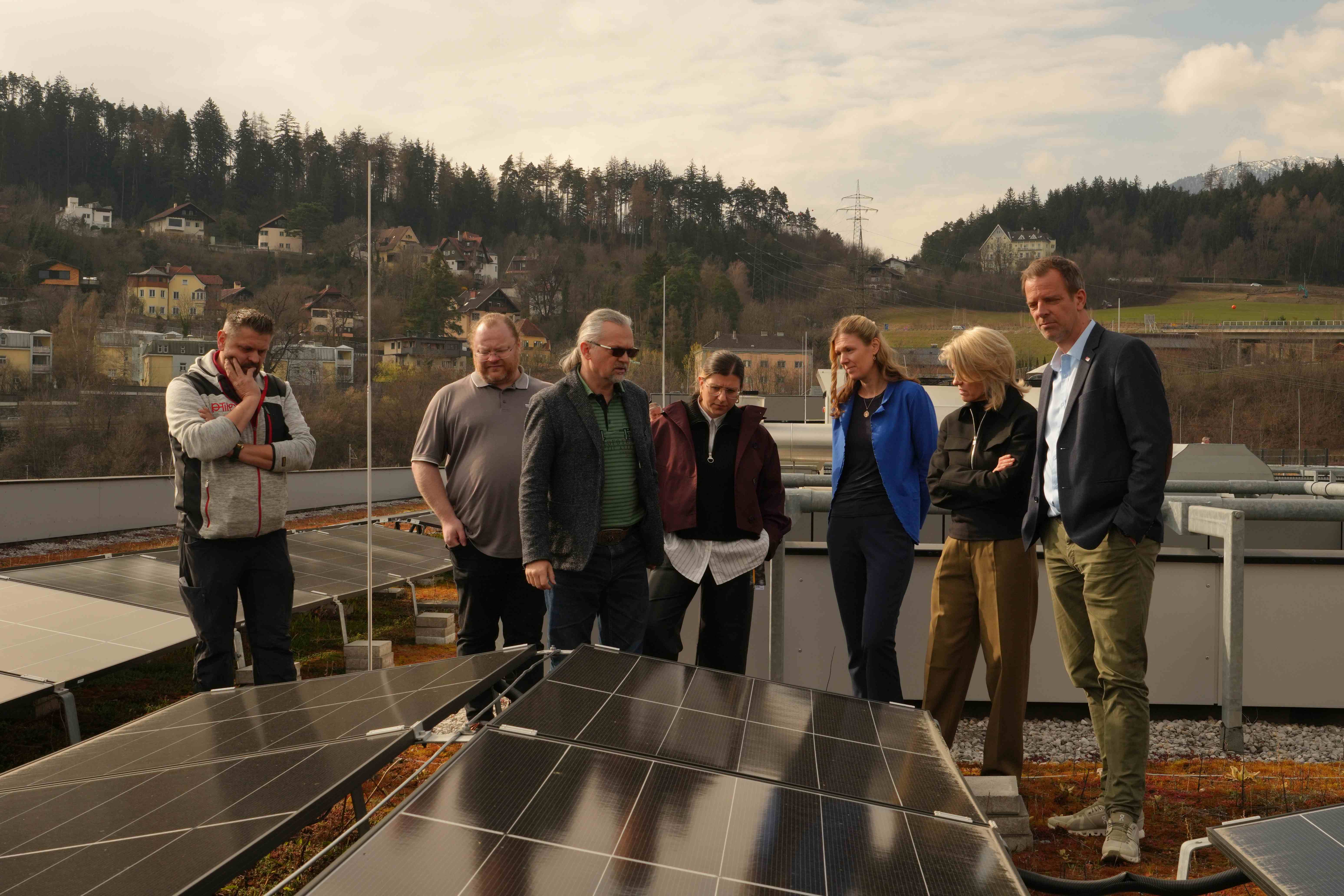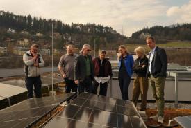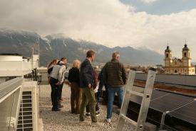 Anfang der Woche wurde die neue PV-Anlage von der Bundesimmobiliengesellschaft (BIG) als Eigentümerin der Liegenschaft offiziell an die PH Tirol übergeben. Nach einer Besprechung zur Übergabe der Anlagendokumentation im Büro der Rektorin besichtigte das Team der PH Tirol mit Rektorin Regine Mathies, Vizerektor Gregor Örley, der Fachstellenleiterin für Bildung für Nachhaltige Entwicklung Martina Überall sowie die Kolleg:innen aus der Verwaltung und Haustechnik gemeinsam mit dem Team der BIG rund um Projektleiter Werner Kohlegger und Assetmanagerin Andrea Grill die neue Anlage direkt vor Ort: Am Dach des Campus, an dem die Solarpaneele sichtbar sind.