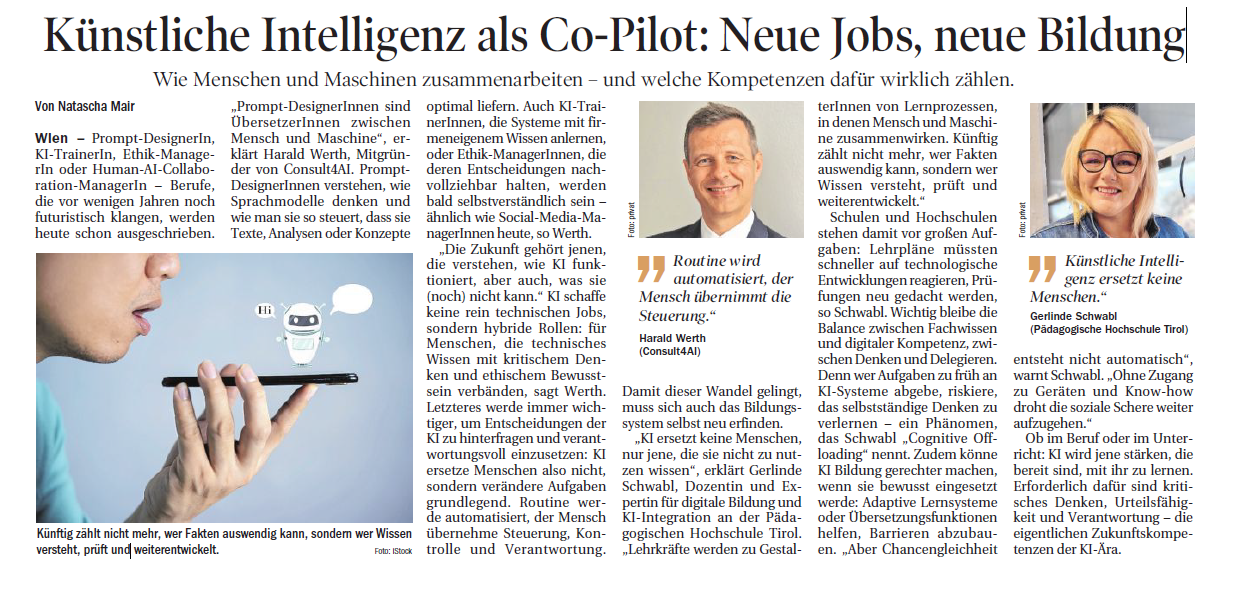 Ende Oktober sprach die Tiroler Tageszeitung mit unserer KI-Expertin Gerlinde Schwabl. Der Beitrag unter dem Titel "Künstliche Intelligenz als Co-Pilot: Neue Jobs, neue Bildung" ist am 25. Oktober 2025 erschienen.