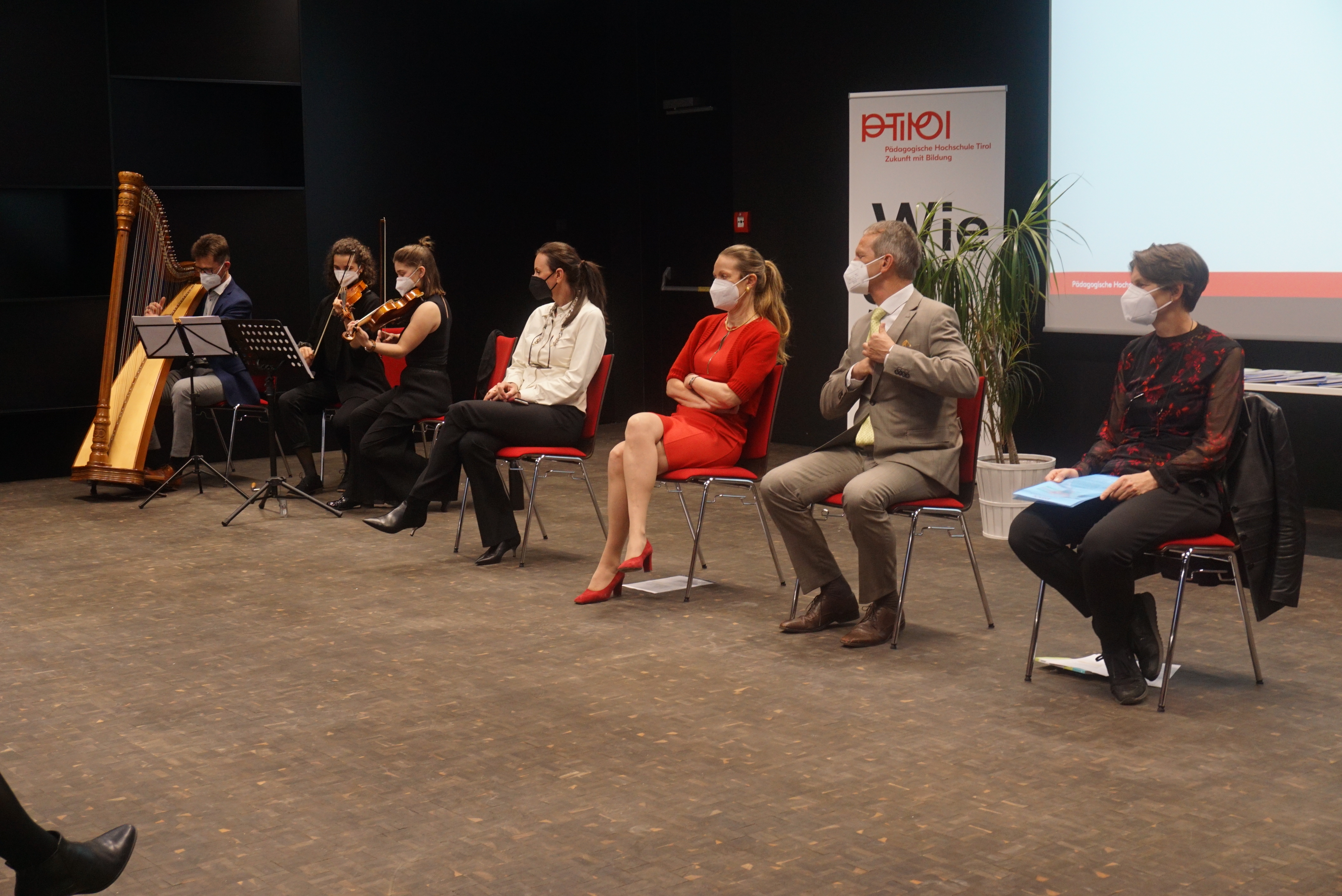 Im Rahmen der Masterfeier konnte das interessierte Publikum – vornehmlich virtuell zugeschaltet – auch einen persönlichen Einblick zu Arbeitsprozess und Ergebnis der erfolgreich abgeschlossenen Masterarbeiten gewinnen. Peter Kostner an der Harfe und zwei Studierende an der Geige umrahmten die feierliche Atmosphäre.