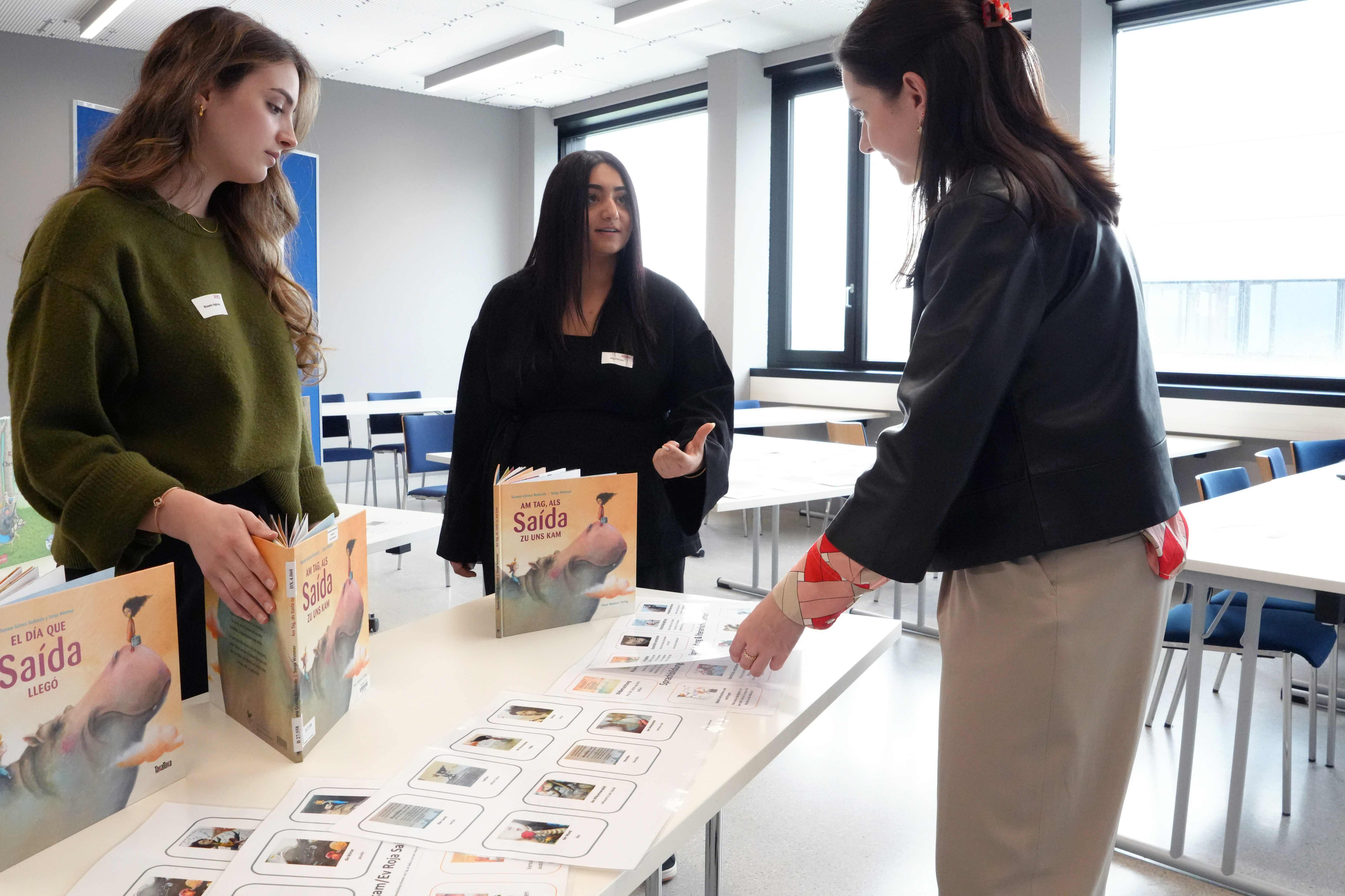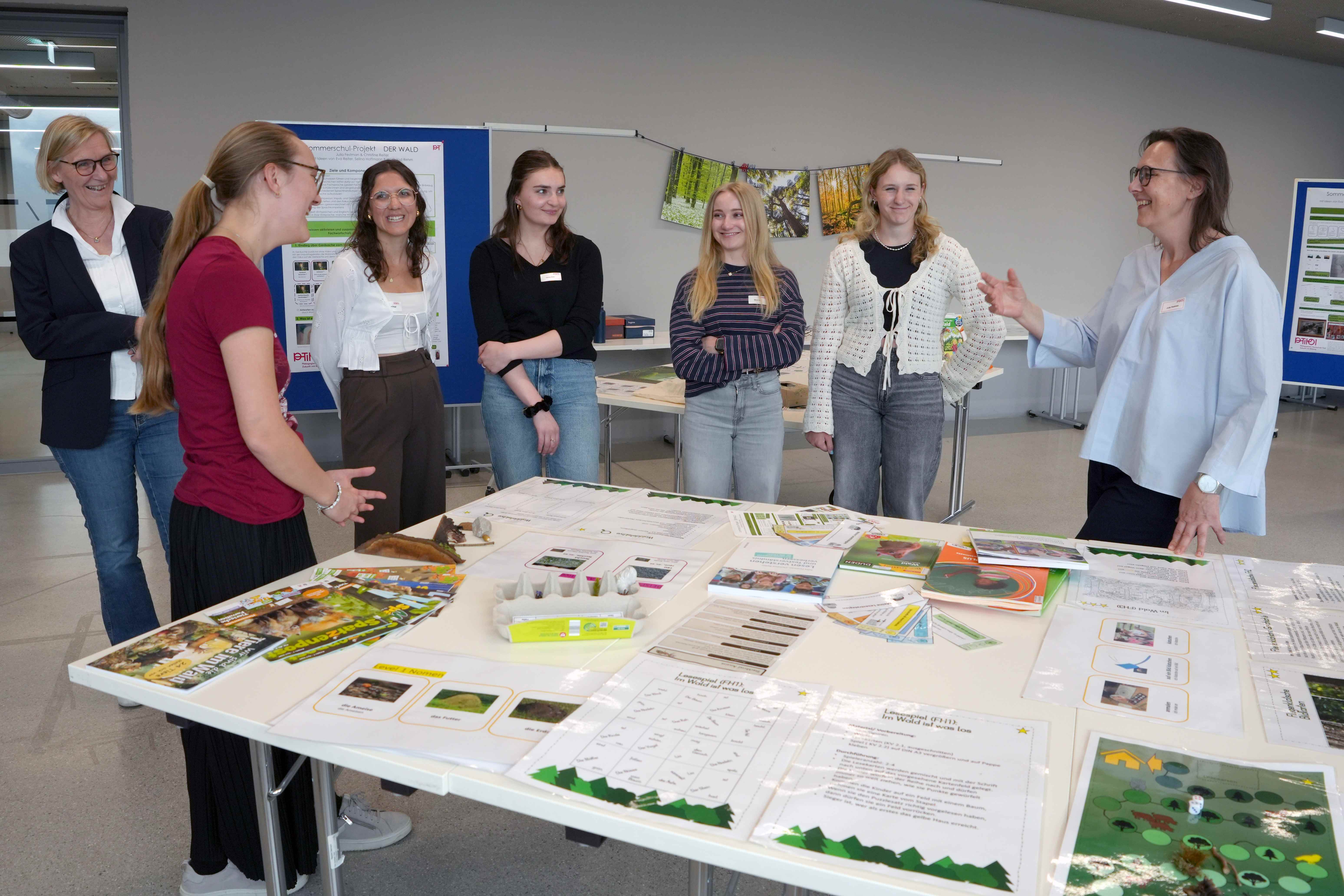 Am Nachmittag stellte das Tagungsteam – Studierende, Lehrende der PH Tirol und Lehrer:innen – vielfältige Materialien vor. Gezeigt wurden u.a. der Lesekoffer, verschiedene Förderspiele, themenbezogene und diversitätssensible Materialien zum Thema Wald, Wohnen und Kinder dieser Welt, aber auch Schüler:innenprodukte aus den Sommerschulen, beispielsweise Briefe von Kindern. Das Repertoire der Materialien erstreckte sich von bereits in der Sommerschule bewährten Materialien, wie jene aus den von Festman (2025) entwickelten Sprachenkoffern, zu gänzlich neuen Materialien, wie jenen zum diversitätssensiblen Arbeiten mit Kinderportraits. Alle vorgestellten Materialien sind mehrfach binnendifferenziert – d.h. sie können von der Anfänger:in bis zum Fortgeschrittenen verwendet werden, somit lernt jedes Kind auf seiner Entwicklungsstufe. Dadurch eignen sich die Lehrmaterialien besonders für die Arbeit in heterogenen Lerngruppen, sowohl in der Volksschule als auch in der Mittelschule oder Unterstufe. In parallel stattfindenden Workshops konnten die Materialien dann gleich ausprobiert werden.