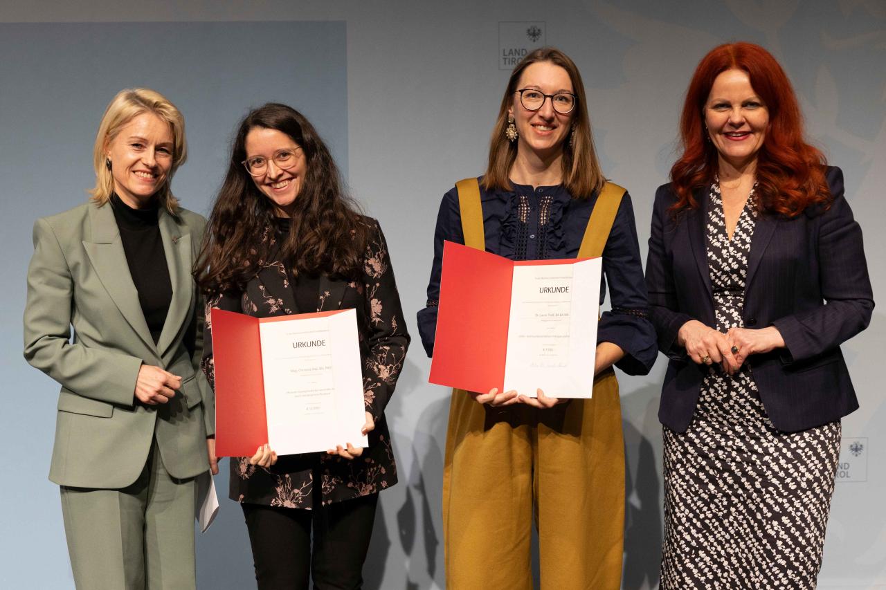 Zwei Forscherinnen der PH Tirol, HS-Prof.in Christina Imp und HS-Prof.in Laura Trott, wurden am Montag, den 26. Jänner 2026 in einem feierlichen Festakt im Tiroler Landhaus durch Wissenschaftslandesrätin Cornelia Hagele mit der Tiroler Nachwuchsforscher:innenförderung ausgezeichnet.