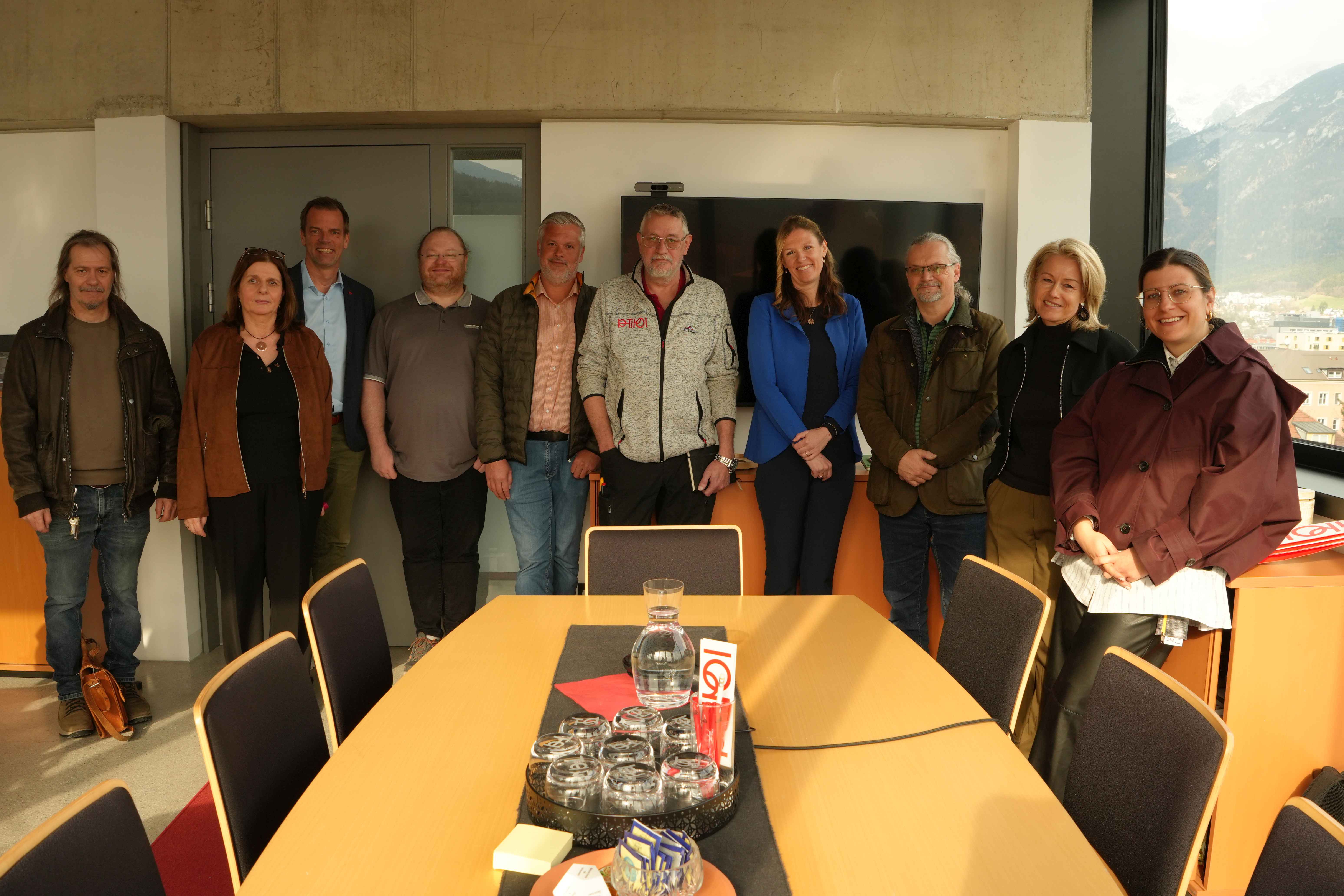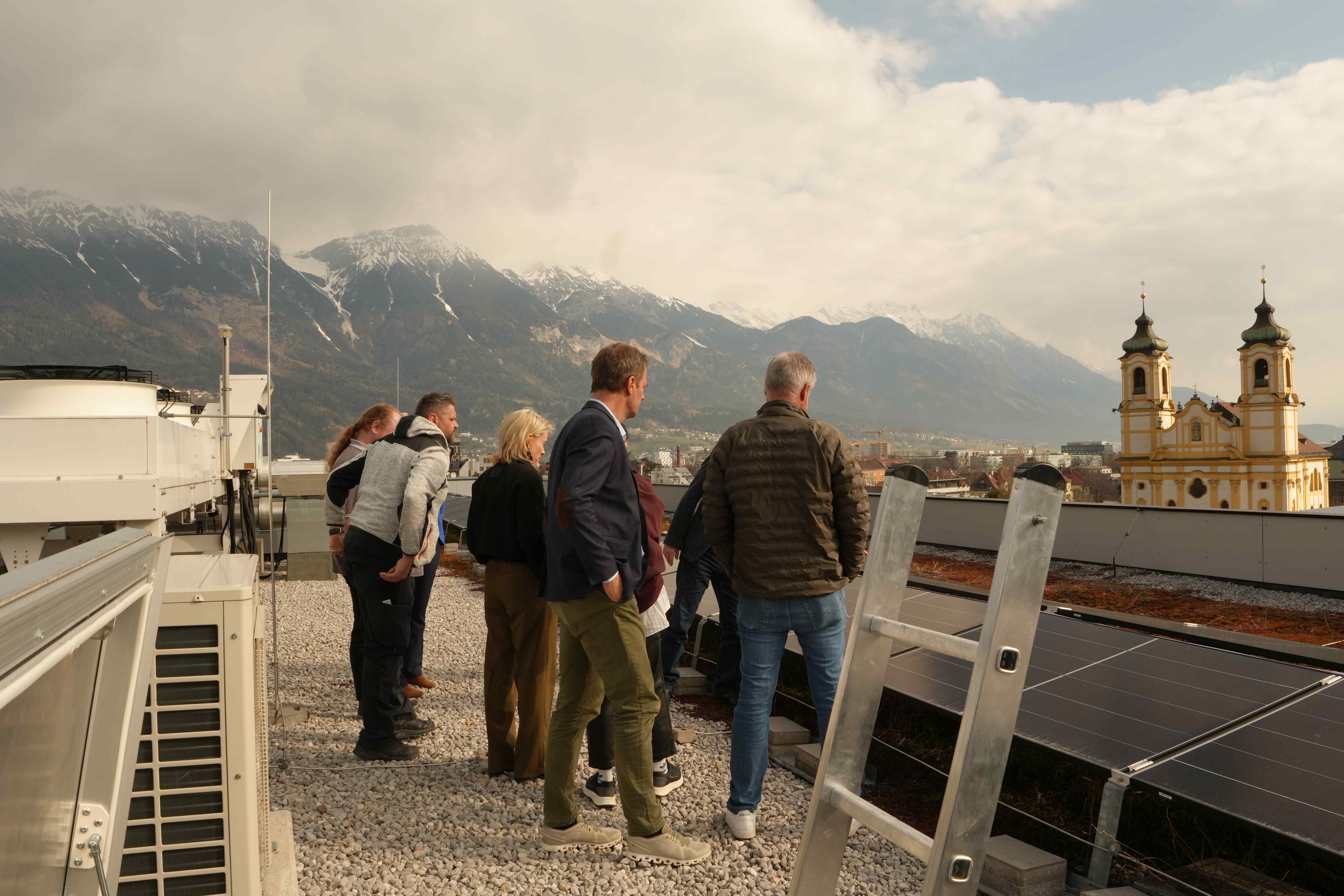 Anfang der Woche wurde die neue PV-Anlage von der Bundesimmobiliengesellschaft (BIG) als Eigentümerin der Liegenschaft offiziell an die PH Tirol übergeben. Nach einer Besprechung zur Übergabe der Anlagendokumentation im Büro der Rektorin besichtigte das Team der PH Tirol mit Rektorin Regine Mathies, Vizerektor Gregor Örley, der Fachstellenleiterin für Bildung für Nachhaltige Entwicklung Martina Überall sowie die Kolleg:innen aus der Verwaltung und Haustechnik gemeinsam mit dem Team der BIG rund um Projektleiter Werner Kohlegger und Assetmanagerin Andrea Grill die neue Anlage direkt vor Ort: Am Dach des Campus, an dem die Solarpaneele sichtbar sind.